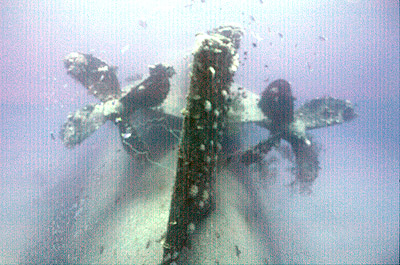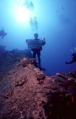 | On the second dive, we explored the bow and the explosion area in more detail. Pat took down an American flag and I photographed him on the starboard side of the bow with the flag - we plan to present the flag to the USS Mississinewa Reunion Group. I took several photos of Pam at key places along the ship. And then, grudgingly, we had to head back up. We were almost out of air but, more importantly, out of time.