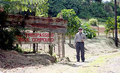 Then we met the boat team at Neco Marine for a debrief. Since Pat Colin wanted to talk with Jack from Marine Sonic, we had him meet us at Neco. Since Steve wanted to chat with us about the maps we found showing where all the land mines are, we had him meet us at Neco. Since the sun was going down, we had a libation. And since I had that burger, I wasn't very hungry. So the team is out to dinner, I got the wireless working, and now I'm calling it a night. Tomorrow is in the jungle with Paul leading us to find a single engine Marine Corsair. And a big shout out to the Saline American Legion. Paul says you're following our exploits. We're happy to have you aboard. Stand at ease. Smoke 'em if you got 'em. I'll be in the area all day. And I hope to have a grand story for you tomorrow. 26 February Now it's tomorrow. A day in the jungle was planned for all. All but Jack. He had some data crunching he wanted to do and get caught up on work for work. Then we got hit by a surprise. Seems Rick needs to return to Seattle. Although Palau is important, all of our responsibilities at home really do take precedence. We're sorry to see Rick go, but not as sorry as Rick is to leave. We'll miss him for the rest of the trip and look forward to the next SSS mission with him in charge again. Standby for P-MAN XII.5. So Rick spent the day dealing with stuff. He had to decide when to actually leave. When we left for the jungle, he hadn't contacted the airlines to see what was available. So the rest of us, Pat, Me, Paul and Mike headed up to Ngatpang to do more searching for a Marine Corsair. Our first stop was unplanned. We drove into the OISCA farm complex (Organization for Industrial Spiritual & Cultural Advancement), mostly because we've never seen the gate open before. A very pretty farm tended all the time. We went in to ask if they'd ever seen any aluminum in the jungle. No. So we left. But at least we got to see a pretty farm.