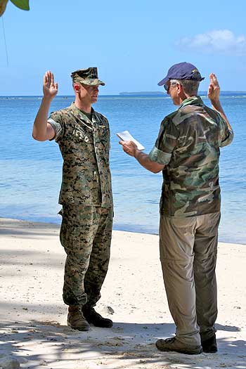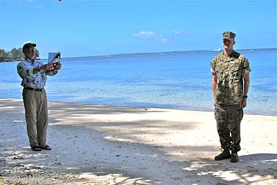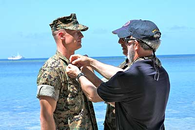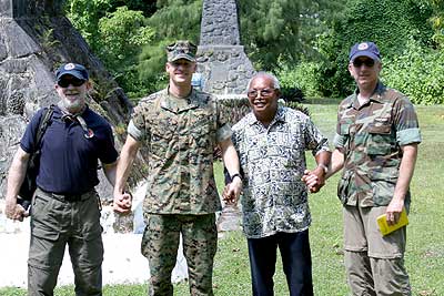 Today was a great day. Today, Captain Warren Bruce, USMC became Major Warren Bruce, USMC. Warren wanted to be promoted on Peleliu and The BentProp Project did its part to make it happen. And then some. But I think I need to take you back a few months to tell the whole story. When Warren said he wanted to be promoted, he just needed someone of equivalent rank or greater to do the honors (That would be me since I am a retired Lieutenant Commander.). Without doing a thing, we had all the pieces in place. However, I thought it would be better to have an active duty Marine do the honors. Since I know a few folks still on active duty, I scoured the world looking for a senior Marine who could officiate. I did find an old friend, but he was not able to get away from the call of duty. In a nutshell, the duty would fall on my shoulders. And Derek Abbey, Warren’s best friend and fellow Marine, said it would be better to have us do it than a Marine who was a stranger. Aside from being tourists on Peleliu, we did not have a reason to go there other than to promote Warren. So preparations were made. We loaded the boat with all of BentProp, except for one person, and headed to Peleliu. We had one hitchhiker on board, Tangie Hesus, Peleliu’s resident historical expert, needed a ride from Koror to Peleliu. He made arrangements for a bus to pick us up and take us to the ceremony site. (I hadn’t seen Tangie in a year and the first words out of his mouth were “You’ve gained too much weight.” Now I’m seriously dieting. But it was last night that Tangie said this. Hmmmm, where is he going with this story. Everyone but one BentPropper on the boat. Saw Tangie the night before. And how did Tangie know we could take him to Peleliu?) Tangie drove us to the Governor’s Office to meet up with the CAT guys. An inspection team from Hawaii was in town so they could not play as they were on a tight time schedule. Tangie also wanted us to meet the new Governor so we drove to where he was. The Governor expressed great pleasure and satisfaction that Warren wanted to be promoted on Peleliu.