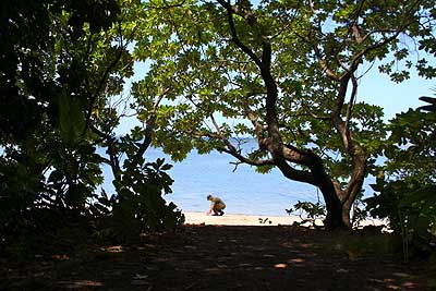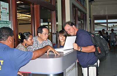 We had lunch at Dolphin Bay Resort, took in a few more tourist sites and then boarded the boat a tad early in order to get a swim call en route back to Koror. We had to get back as Rick and Nicole were going to be the first to leave our ranks this year. Joe stopped part way back in a protected area of a Rock Island. Nice coral and fish to look at for a short swim call. Then back to Koror. A quick pack out and we were driving to the airport. A few days ago, Rick could not locate his passports so he did not leave. His passports surfaced and he got on the first outbound flight he could. In between was the tsunami scare. When we got to the airport, there was no listing for Rick and Nicole, no seat assignments nor any hint that they might actually leave.