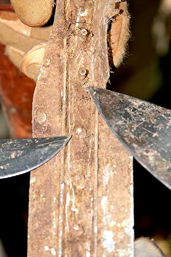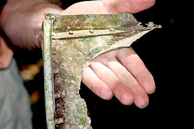 Our ground team, lead by Paul and guided by Joe, was going back to the area that Paul identified as needing to be searched. He laid out an area north of our previous search areas. We’ve covered a significant portion of that area and the team was going back in to do more. However.... Usually, we park the van up the road a bit as it is a shorter hike to our target area. On this day, though, we parked the van at the side of the ball field in the little village just off the main road. This was going to be where the helo dropped us off. Joe would then come down and get us to join the search. But, there was no reason to drop the van at the ball field. The ground team could have put in from the normal spot, Joe could have lead us back from the ball field no matter where they started into the jungle from. So..... As the ground team started in, they traversed an area we had searched in 2007. Joe stubbed his toe against a piece of wood. When he looked down to see what he had hit, he saw metal. Aircraft metal. Needless to say, they did not proceed to the target area. By the time the helo team flew over them to let them know we were done with our mission, they had found two pieces of aircraft aluminum with a couple of hydraulic fittings and lines.