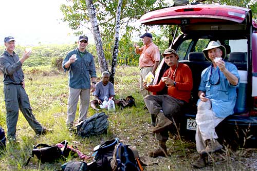 Back to The Butterfly Effect. So, if we hadn’t wanted to take an aviator view of this problem, we wouldn’t have gotten a helo ride. Without the helo ride, the van would not have been parked at the ball field. If the van hadn’t been parked at the ball field, the team would have put in from elsewhere. If they had been elsewhere, Joe would not have stubbed his toe, looked down, and spotted aircraft debris. We flew over the team and spotted Mikey jumping up and down with a piece of something in his hands. We could not be dropped off in the elephant ferns (looks like a cleared section in the jungle but when you get close, you realize it’s not short grass) as the grass is six feet high and the helo did not want to set down there. And I personally did not want to jump. So we went to the ball field, Joe came and got us and we helped find two more pieces. By the end of the day, we had found a total of four small pieces. We don’t have a debris field yet, we just have some debris. Tomorrow, we will bring a metal detector, some help from the CAT team and a couple of brooms and we hope to find more of the airplane.