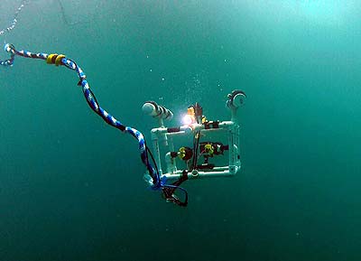 Pete Haber, (Hey!! Not everyone gets 'mentioned in dispatches'. Flip's Chelsea friend and fellow Delta pilot (remember, the only airline to ever buy tickets on.)) said the kids should make some kind of wide area search platform. Maybe a towed camera array. I mentioned it to the ROV team and they created one. It has three cameras on it that feed to topside and their low tech solution once they find something is to quickly play out more line, let the towfish sink to the bottom and stop the boat quickly. Then the ROV can swim down to take a look prior to a diver going down.