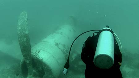 The President showed up in his own boat at about 1130. He met with the students, they explained their vehicles, they gave him some swag from Grand Valley State University and Stockbridge High School (The President is a graduate of GVSU. But I don't think he misses Michigan winters.) and then we went diving. The President dove on the B-24 we found off of Aimeliik a number of years ago. That was the year Tommy Doyle (Casey Doyle's father, Jimmie Doyle's son) came out to dive the airplane his father died in during World War Two. He expressed interest in seeing this Corsair as it is one of the nicest aircraft wrecks in the world. It's sitting at the bottom of the ocean intact, except for the damaged oil cooler that was the reason the airplane lost power and had to ditch.