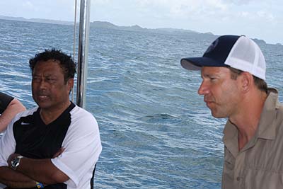 But since a day on the water is better than any day in the office, the President of Palau, Tommy Remengesau, Jr., came to our boat to see the ROV team and their vehicles and the number two at the U.S. Embassy, Tom Daley, joined us right at the start of the day's mission. Both wanted to dive the Corsair which was where the team got to test their vehicles.