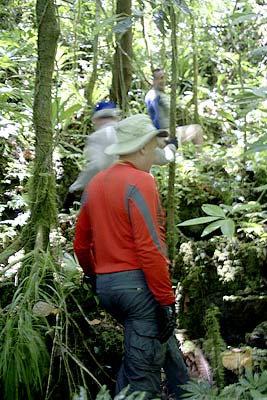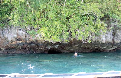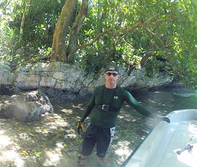 It's always better if someone who has information is willing to show us personally. Billy was and he jumped on board. Part way to where he was taking us, we figured out we already know his site. So we started to take him back to his farm when he said why waste the gas, he'd hang with us. We still needed some more surface time so he suggested a hike in the woods. He's hiked all over the Rock Islands and says there's plenty of pieces of metal up on the islands. Plus, no one really knows what's in the marine lakes. So we followed him onto a rock island. Normally, we gear up for any land work in all our hiking kit: water bags, good boots, radios, etc. Did we have any of these things? Nope. Did we go anyway? Yep. If Billy can go barefoot with nothing else but a swim suit and wetsuit top, so can we. Except that barefoot thing. Pat doesn't like us to do that and makes us sign a contract that says we come out in the same condition as a Palauan who goes barefoot. No one has signed on the dotted line.