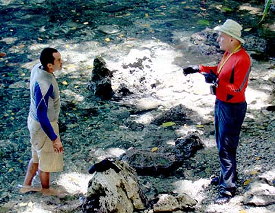 When diving to a depth of 100 feet, you do not have much working time before you become nitrogen saturated. Then, you have to have a pretty good surface interval before you can go back down with any amount of bottom time to do more work. So we shuttled off to meet with our clam farming contact. We met up with Billy Watson at his clam farm. Well nearby anyway. He was out hunting corals for reseeding. We found him around a rock island and conducted our interview. Billy is a young guy and his business is aquaculture. He sells giant clams and corals for reseeding and aquariums around the world. A Palauan, he grew up in Maine living with his uncle, but came back to Palau to live.