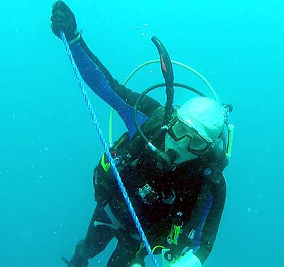| P-MAN XV Update #13 - Deep dives to ID an aircraft. Barefoot in the park. 04 April Any day on the water is better than a day in the office. We had three items to accomplish today. Meet up with a guy at his clam farm to talk about planes he's seen, do some more ID work on the suspected Japanese airplane, and take the Vice President out to the Corsair site that was located last year. We got an early start so went to our airplane site first and made two dives on it. We sent Joe, Pat and Casey down to do some photography work and dusting. Then Dan and I went down to do some more.