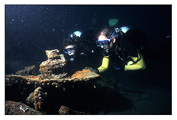 Although we noted many magnetometer hits, repeated dives on each site failed to reveal any new crash sites (of either the '453 B-24 or Bob Dilks' Corsair). The false hits seemed to fall into at least three categories: 1) software problems which hindered interpretation, 2) detection of true positives that were not aircraft (eg, fuel bunkers, marine engines and other iron-containing debris) and 3) detection of false positives (positive signals on the magnetometer but nothing sighted upon diving). We have subsequently heard of one report from the Caribbean area, which suggests the phenomenon of detecting a positive magnetometer reading, associated with a coral head without an obvious iron deposit, is not unique to our experience. It is also possible there are unappreciated natural sporadic iron deposits in this area. Finally, it is possible that these reported crash sites either never were or are no longer present [Note: when there is no local knowledge of a particular site, we only attempt searches on sites that have at least two independent reports - usually consisting of the official after action report and at least one surviving veteran's recollections/log.]