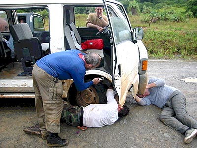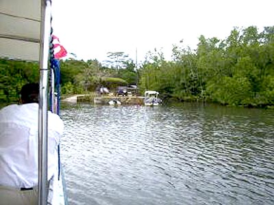 helped run the Seabees 4 wheel drive vehicle off the road, visited two monuments to the war dead and future peace, ate great Japanese food, and managed to cover every square inch of the van with mud, both inside and out. When traveling from Koror to this island, once you cross the nice new bridge, you have 45 seconds of pavement, 3 minutes of cinder roadway, and then dirt or mud depending on the rain quotient. Also, every inch of the road is under construction as they are trying to build a real roadway all around Babelthuap. Today, we went back to the site. En route, we made two stops at some local hunters/fisherman houses on the island as they have some intel for us.