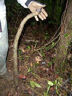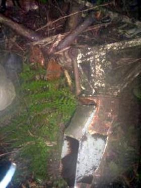 Back to the site. Not raining so the really big torrents that we could leap across were almost back to rivulets. Took video of everything. Found more pieces. There must be a lot more of the airplane below the surface of the mud. We suspect through the natural erosion of the wet tropical forest, over time, the pieces accumulated down in the gully. In addition to what we found yesterday, we found a rudder pedal with fore and aft adjuster and brake cylinder, vertical stab, turtle back, mid fuselage and more. The tail was found the first day, sitting on the side of the gully.