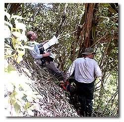 Exploring these different jungles creates different experiences. On the coral, as you climb, you use its natural nooks and crannies; on the wet clay, you crawl upwards on your hands and knees. And if you fall on coral, you do not slip and slide, you get punctured and sliced. From time to time, you do get reminded you are not alone, often at most inopportune times, such as when a land crab scurries out of your targeted handhold an instant before your (gloved) hand�s unbalanced purchase; there are other more private situations, best left unstated, where land crabs can be, well, disruptive. But the one item, which becomes the climber�s scourge (follow-on pun intended) particularly on these coral islands, is a type of vine, more thorn than vine actually, that has a habit of finding the most delicate and inaccessible regions of a climber�s anatomy. Long sleeve shirts, gloves, neck protection, hats, glasses, long sturdy pants and boots with long socks all help, but these vines, so intimate with the coral, mock all efforts to avoid them. I have seen machetes in the hands of skilled users bounce off these cursed vines and even successful transection comes at a cost � forward progress is often measured only in tens to very few hundreds of feet per hour.