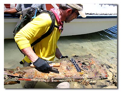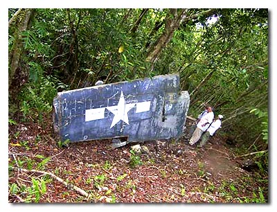 c) Peleliu F6F Hellcat Wing, 15APR02 Our Peleliu guide, Tangie Hesus, took us to the intact wing of an F6F Hellcat, which appeared to have been moved to its current location. The wing, lacking specific aircraft or unit identification of any kind, appears to have been sitting on its ventral surface for some time, with the dark blue dorsal surface with a white star-and bar remarkably well preserved (perhaps covered or in shaded area?).