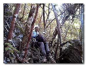 We expanded our exploration to Ulebsechel. Joe spread the word around Koror about our search and several Palauans reported to us that aircraft debris had been seen somewhere along the ridgeline of this long island. We began our search on the most western end of the island, near the Japanese boat repair works and while we found a number of interesting artifacts most likely related to the Japanese occupation, our preliminary search was negative. We did find a small aircraft-related debris field, as yet unidentified, along the water�s edge of the boat repair area, mentioned above in Attachment 2 b. At the recommendation of Palauan elders, we then began working with Vernon, a young hunter who recalled seeing wreckage a few years back. Vernon selected a starting point along the shoreline and we started climbing. On top, we split into two groups and searched carefully on both sides of the ridge without success. That day, the day after our memorial for MAJ Nelson (see below, Attachment 7), we all stopped at 1100, along with Jim Nelson, to watch the VMF-225 F-18 �Missing Man� flyby in tribute to his father. Not able to see them through the dense canopy overhead, we heard them well. We continued on looking until exhaustion, finding nothing. Later Dan O�Brien calculated that over the entire day�s mission, we had traveled no more than a linear quarter mile.