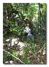 a) MAJ Nelson/LT Houle Crash Sites, 13, 17, 21, 23 April 02 The P-MAN IV team spent much of its stay on several islands between Koror and Malakal. Unlike these latter two islands, which are the most populated in the Palauas, the surrounding islands we explored, so near �civilization,� are uninhabited (except for one small compound on one island). The jungle has grown over the steep and jagged coral (called - for good reason - �porcupine� coral by the locals), rising very rapidly up to 200 feet above the ocean. The coral walls combine with the dense humid jungle and those omnipresent vines to make the going very slow and difficult. Some of these islands are frequented only by hunters, who often stick to well-worn trails.