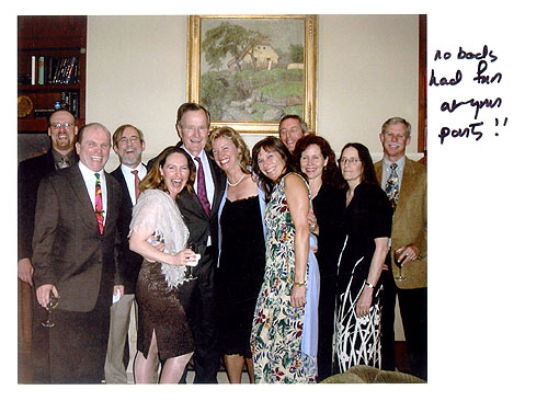 | Update Series, #11, if you don't count the EPILOGUE, or 12 if you do Hello, Everyone! Just when you thought it was safe to open your e-mail, along comes another tome from Flip. A lot has happened since we got back from Palau. Some of it will have an impact on next year’s mission, and some just had a great feel to it. I thought I would share it with you since I’ve shared everything else. Well, everything except the secret stuff. I haven’t shared that, yet. And if I did, I’d have to k…….. After the BentProp Team returned to CONUS, we all settled into our usual routines. Some of us fly, some of us work for a living. But we were all corresponding, keeping in touch as teammates do. The best thing about this group of people is the sense of camaraderie that we have for each other. Regardless of the distance and time spent away from each other, once we are in the same locale, it’s as if we never parted. Back in March, I spoke with Jim Nelson, QB’s son. (As an aside, Jim and Neel are planning on going to Palau next year while we are there so he can have a look at his Dad’s Corsair crash site.) He had some video and still photos of our expedition and wasn’t really sure what he was looking at. I told him it sounded as if he needed a Navy guy to come down and ‘splain things. We just had to pick a date. After I bid my April schedule, we agreed upon a set of days. Rebecca and I would come down, explain some of the video and still images, and make a social time out of it. What could be simpler. Well coincidences are still following us around. Just so happens that Pat Scannon (Mr. BentProp to you, El Jefe to me.) was going to be in Texas for business. Jim, a perfect fit for our group, coalesced a plan. He invited the entire BentProp team for a party at his place in Houston. That only meant that Val & Jim Slocum, Dan and Cynthia O’Brien, Jennifer and Tom Powers-Krasney and Clem Major and Cathy Orlando had to figure out how to get there at the appointed time. Everyone figured it out. We rallied at Jim and Neel’s house and we quartered ourselves there, and at a local hotel. The itinerary was to be dinner on Wednesday night with whoever was there, cocktail party and dinner as the main event on Thursday, and Friday was to be casual day. Jim and Neel picked us up at George Bush Intercontinental Airport in the early afternoon and we started schmoozing and swapping stories. Jim and Neel are wonderful hosts, have a beautiful home and know how to have a good time. And they know how to pull the wool over everyone’s eyes! As time went on, more and more folks showed up. We had a good group for dinner the first night and went to a local fish restaurant. More schmoozing and chatting until the wee hours. Up at the crack of dawn. Okay, maybe not that early. Great breakfast, walked the dog and waited for the rest of the crowd to show. Our first appointment was at 5pm or so for the cocktail party. We were told that this would be a coat and tie affair. Seems that Jim and Neel wanted to invite some of their neighbors to meet us. And their daughters would be there too. One lives in Houston, and the other came in from New York City. We all clean up pretty good, and no one made any wardrobe faux pas. Well, except me of course. But you knew that. We held a small ceremony commemorating QB. Just the Nelson family and the BentProp group. Then Jim told us of his guest list. The neighborhood Jim and Neel live in is unique in Houston. A number of oilmen and their wives (of some repute and historical significance) were the friends that The Nelsons invited. All served in World War II. One of the guests was a Marine who was wounded at Guadalcanal. Another was a Navy Captain. Ship driver I believe. And another was a flyer. Then Jim and Neel both smiled like Alice’s Cheshire Cat. I thought for sure they were both going to vanish. “Oh, by the way, there is one more couple coming.” Jim announced. Their neighbors of three doors down were coming. Seems he served in the War too. And then some. “President and Mrs. Bush will be here.” (Just to be clear: #41, not the current President, #43) With the utterance of this one sentence, all my memory cells were overloaded, so all quotes are made up and I’m not even sure the story is accurate from the beginning. We were given the protocol standards and told not to bother the men with the wires coming out of their ears. One item of protocol was not to have a bunch of cameras in President and Mrs. Bush’s faces. If they want a photo op, they’ll let you know. Seemed fair to me. The guests started to arrive and the stories started to flow. The neighbors and the out of town guests all got along famously. I didn’t even realize that President and Mrs. Bush had arrived. They were just part of the crowd. Then it happened. We were all on our best behavior with the President and his bride in the room, when Mrs. Bush said, “Of course you want a picture with the President. Slide along side.” Then she whipped out her camera and started snapping away. It was hard to get her in a picture.