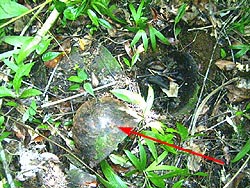 - The second cemetery was in the jungle and adjacent to a bunker. This cemetery appears to still contain human remains. I counted six undisturbed grave mounds in an area of 40X60 feet. This formal plot has a border of stones around it and each grave likewise was delineated by stones. The role of the bunker (Fig 5-2), placed into the side of a small hill about 100 feet SSW of the cemetery, is uncertain. It measures approximately 8X10 feet with walls two feet thick, is empty inside and may have been a bomb shelter as the only opening is a doorway (door missing) facing north toward the cemetery . Flip found evidence of a light rail system that appeared dismantled but heading in a westward direction. The Palauan guides told us this is one of two areas said to have had a Japanese flag pole made of solid gold (never found). Needless to say, this area has been exhaustively searched by Palauans, although only one grave appears to have been disturbed.