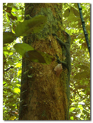 | P-MAN VII Update Friday, 4 March Today was a boat day. We had an almost glassy-smooth trip down to Peleliu outside the reef on the east side. There, we picked up Johnny, a Palauan we had interviewed last week who said his brother (who has since passed away) found some quite large aircraft wreckage on the island of Mecherchar (pronounced "Merar."). This is the island in the middle of which is the famous "Jellyfish Lake," a mostly freshwater lake that contains millions of non-stinging jellyfish. There are several other landlocked marine lakes on the island, too, parts of which are surrounded by mangrove swamps. It's in the mangroves adjacent to one of two lakes (Johnny wasn't sure which one) where Johnny believes his brother saw this wreckage. The only way to get to any of these lakes is to put the boat in at one of several tiny beaches and hike up over the hill to the lake. Sounded so simple when we described it that way to ourselves. But here's the thing: this is also the island that since the 2003 expedition has been called "Flip-Flip Island" by the BentProp team. The reason is that the footing is SO bad, and the terrain SO unforgiving, that when Flip Colmer did a bit of a front flip (Flip-flip - get it?) on one of the jagged coral places (which comprise roughly 99.9% of the island's surface), he wound up with a scar on his butt that looks remarkably like a map of Babelthuap - so they say...I haven't asked to see it. So anyway, we covered a huge amount of the island, including virtually all of one of the mangrove swamps. But when Johnny tried to find the other lake, we wound up - after a long hike - climbing down into the bowl that contains Jellyfish Lake (which is NOT the one he wanted). Some of us feel that his initial navigation may have been a little off. We're planning to go back, possibly on Monday, but need to study the maps pretty closely before we go. The place is beautiful, but VERY steep and covered with loose coral rocks that look and feel more like broken bottles than anything else. As dangerous as it was, we appear to have come away with no serious injuries. A fair number of bruises and aches and pains, but nothing that required stitches. We'll do a quick check in the morning, but so far it appears that we also managed to avoid any serious poison-tree encounters, thanks to Joe's frequent pointing out of the many poison trees that live there. Definitely the coolest wildlife encounter of all of my time here in Palau happened mid-morning, when Johnny lobbed a rock at something in the bushes. The creature scurried off and climbed part-way up a large poison tree. No one had previously mentioned to me that there were dinosaurs living on these islands, but by golly, this critter almost qualified. It was a lizard...a little over five feet long! Joe says these monitor lizards are common on many of the islands. Definitely not aggressive toward us, but definitely non-trivial on the lizard scale.