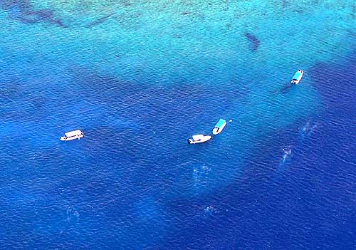 We did a little reef exploring on the way back (Matt has been a great and enthusiastic supporter of our work, and doesn't mind occasionally dropping down to circle at 500 feet to get a closer look at some suspicious object in the water or the jungle). We may have spotted a new portion of the Scullin Avenger that we identifed a few years ago on the eastern reef north of Peleliu. It appears that a large wing section may have recently been uncovered in the sand by the wave action produced by an unusually long, strong stretch of easterly winds. We also did a few turns around an area of Mecherchar that we intend to explore in a few days. We saw tons of SCUBA divers enjoying themselves in the crystal-clear water at "Blue Corner," and even did a low 360 over a pair of huge manta rays romping on the surface.