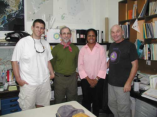 | P-MAN VIII Update #15 Today was an administrative day. We spent part of it trying to arrange a meeting with Governor Jackson of Peleliu, but that hasn't happened yet. We also tried to track down several of our other contacts, without success. The BIG treat came when we stopped by the PALARIS office (that stands for Palau Automated Land And Resource Information System, sort of like the Bureau of Land Management). They're the people who turned us on to OziExplorer a couple of years ago: mapping software that has completely revolutionized the way we're able to visualize our searches by superimposing our GPS waypoints on topographic maps and actual aerial photos of our search areas. We wanted to check on a Navy imaging system that we'd heard about last year, to see if any new imagery of Palau might be available (it wasn't). The other thing we needed to do was to meet and pay our respects to the new Program Manager of PALARIS who recently replaced the person we'd been dealing with for the past few years. We were pleased to learn that the new Program Manager, Vernice Stefano, knew of our work. But we were absolutely ecstatic to discover that only a couple of weeks ago, she had spent a week in Washington, D.C. at the Library of Congress, where she found a large collection of original Japanese maps of Palau from the time of WWII and before. Uh...we've been trying to track that stuff down for several years, but we've never been to the mapping section at LOC! We started jumping up and down and hovering around a set of copies that Vernice had made of a couple of large maps. She had photocopied larger maps in pieces, so we started laying out the pieces on her table and trying to reconstruct the original.