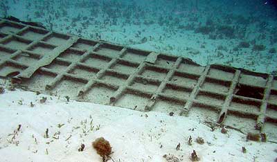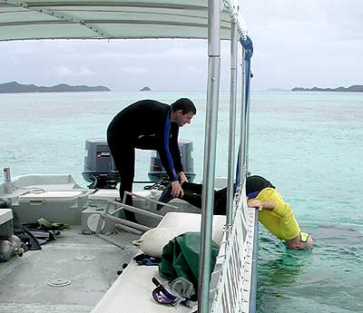 | P-MAN VIII Update #17 A water day. We finally had a water day. We've been wanting to get back down to Ngerechong, which sits right on the fringing reef on the east side close to Peleliu, to see if we could extend our understanding of the debris field associated with an Avenger crash there (Scullin). Just inside the reef, there's an Avenger main landing gear assembly just south of the island. It's surrounded by widely scattered small parts. When the wind is out of the east, as it is this time of year, big waves crash onto the reef there, but Joe had said the bottom slopes gradually away from the reef to the east, down to about 80 feet, before dropping off into very deep water. On a day when conditions were right, Joe said, we could explore the area just outside the reef from the landing gear to see if any other parts of the aircraft might have landed just outside the reef but before it drops off to a depth of several thousand feet. Since we have an underwater-capable metal detector on this trip, we thought it might also be good to get out there and ping the shallow area around the landing gear to see if we could turn up anything more of the aircraft inside the reef. One other intriguing twist is that as we were flying back to Koror from Peleliu earlier in the week, we made several low passes over the area and saw what appeared to be part of an Avenger wing, in a previously unexplored part of the shallows just inside the reef. It was definitely a new object, which had probably been buried in sand and was recently uncovered by the long stretch of strong wind from the east. So there were three things on our list: check out the new "wing," use the metal detector in the shallows inside the reef, and do what would probably be a drift dive outside the reef, to see if any aircraft parts might have rolled down the shallow slope out there. We began by investigating the wing. We found it fairly easily, and even from the boat it looked like it had some of the internal structure of an Avenger wing. We were there just after high tide. The depth was only about 6 feet, and the current was running very strongly out toward the reef. We anchored near the object, and struggled against the current to get over to investigate. The object turns out not to be an Avenger wing; it looks more like part of a boat hull.