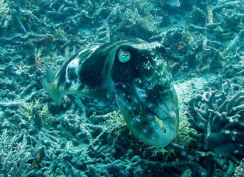 We decided to head outside the reef and see what the area looked like. We wanted to figure out where we'd dive if we did choose to try a dive out there, and needed to judge whether the wind and wave conditions would permit us to dive safely. It looked like wind and waves were going to cooperate, but we wanted to wait until the tide was closer to the low end, with the current not coming so strongly off the reef and out to sea. We headed back inside the reef to the north side of Ngerechong, where there was a nice protected area where we could do a practice dive. Pretty amazing - we've been here two weeks, and this would be our first real dive. We always do at least a short dive under benign conditions just to get our gear and weights adjusted, and to get used to diving with each other. This area turned out to be ideal. Less than 50 feet, pretty coral, not much current, and good visibility. The coolest marine life that we encountered was a couple of cuttlefish, each about the size of a rugby ball. I think they're related to squids and octopi. They're capable of lightning-fast changes in the brightness and color of their skin, and when they're agitated, they can flash like a neon sign. Pat, who generally tries to ignore underwater fauna, actually approached one of these critters and got close enough to touch it.